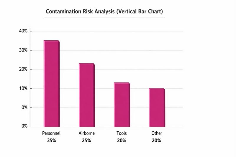 Pystysuora pylväskaavio osoittaa, että henkilökunnan liikkuminen vaikuttaa eniten ristikontaminaatioon puhdastiloissa, mikä korostaa asianmukaista pukeutumista ja pyyhintäkäsittelyä.
