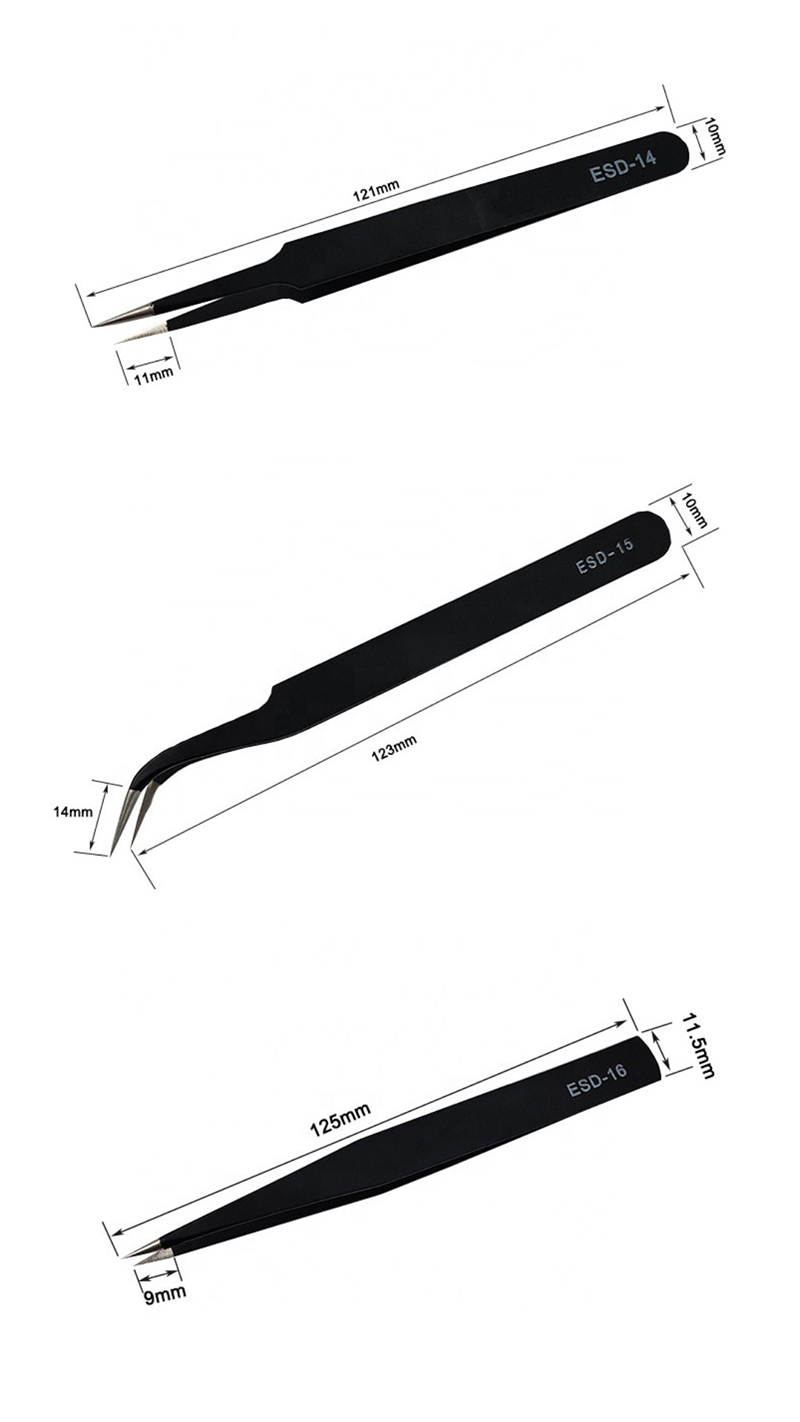 3. ESD-12 (korkea joustavuus): Kärki on kiinteä eikä taipu edes kiinnittäessäsi piirilevyä voimakkaasti varmistaen osien turvallisuuden.